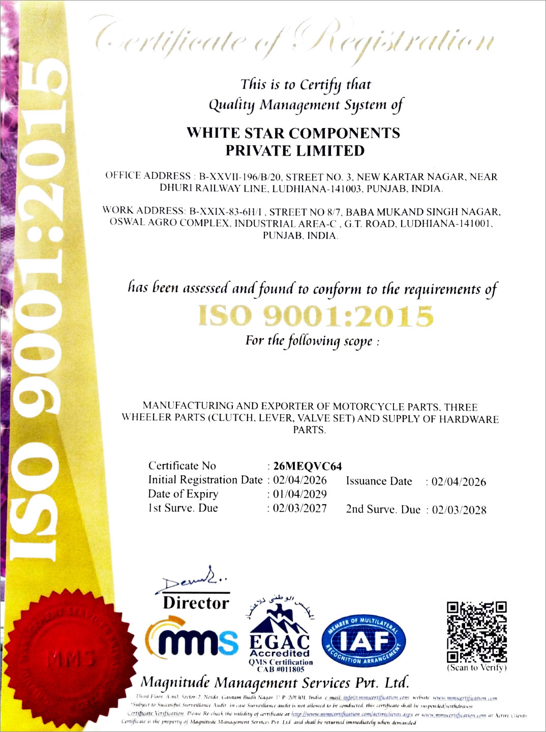 WHITE STAR COMPONENTS PRIVATE LIMITED is an ISO 9001:2015 certified company. below is our ISO certification.